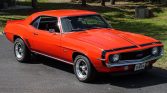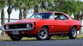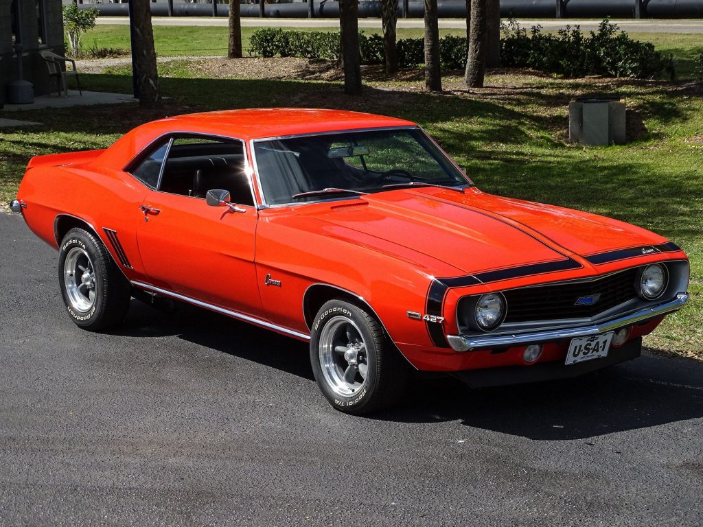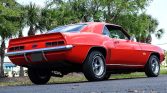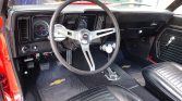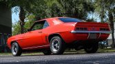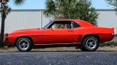 Like the COPOs and Yenkos of the day, the 1969 Camaro we have here is powered by a 427 CID V8! With an aluminum intake, Holley 4-barrel carburetor, full-length headers and an HEI ignition, it packs a punch! Power is then sent through a 4-speed manual transmission with Hurst shifter and classic white shifter knob. A stout 12-bolt rear end with traction bars puts that power to the ground. Slide into the black vinyl bucket seats, buckle the seat belt and turn the key to hear this big block muscle car roar to life! The exteriors is painted in a stunning Hugger Orange with black stripes that compliment it nicely. American Racing Torq Thrust wheels give you a sneak peek at the power front disc brakes with drilled and slotted rotors. Front and rear spoilers are a must on a first-generation Camaro, and this one has them! Add to that a cowl hood, and you’ve got one of the meanest looking muscle cars ever built! The trunk is clean and nicely detailed with a correct trunk mat. This is a very clean, nicely restored Camaro in the most desirable year, with a big block and a 4-speed transmission. It won’t last long. Power steering, power brakes, vinyl interior, alloy wheels, radial tires and seat belts round off the list of options.